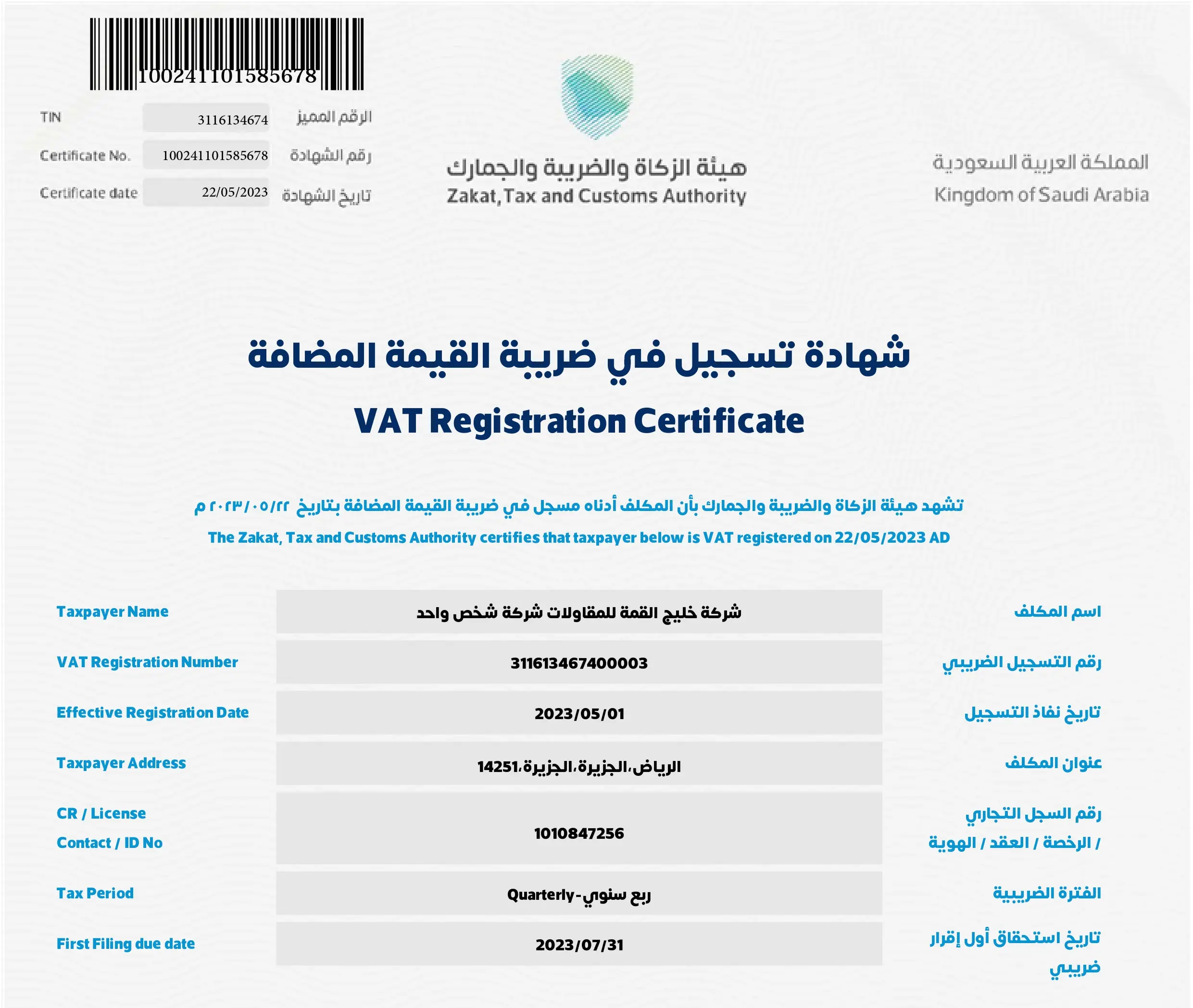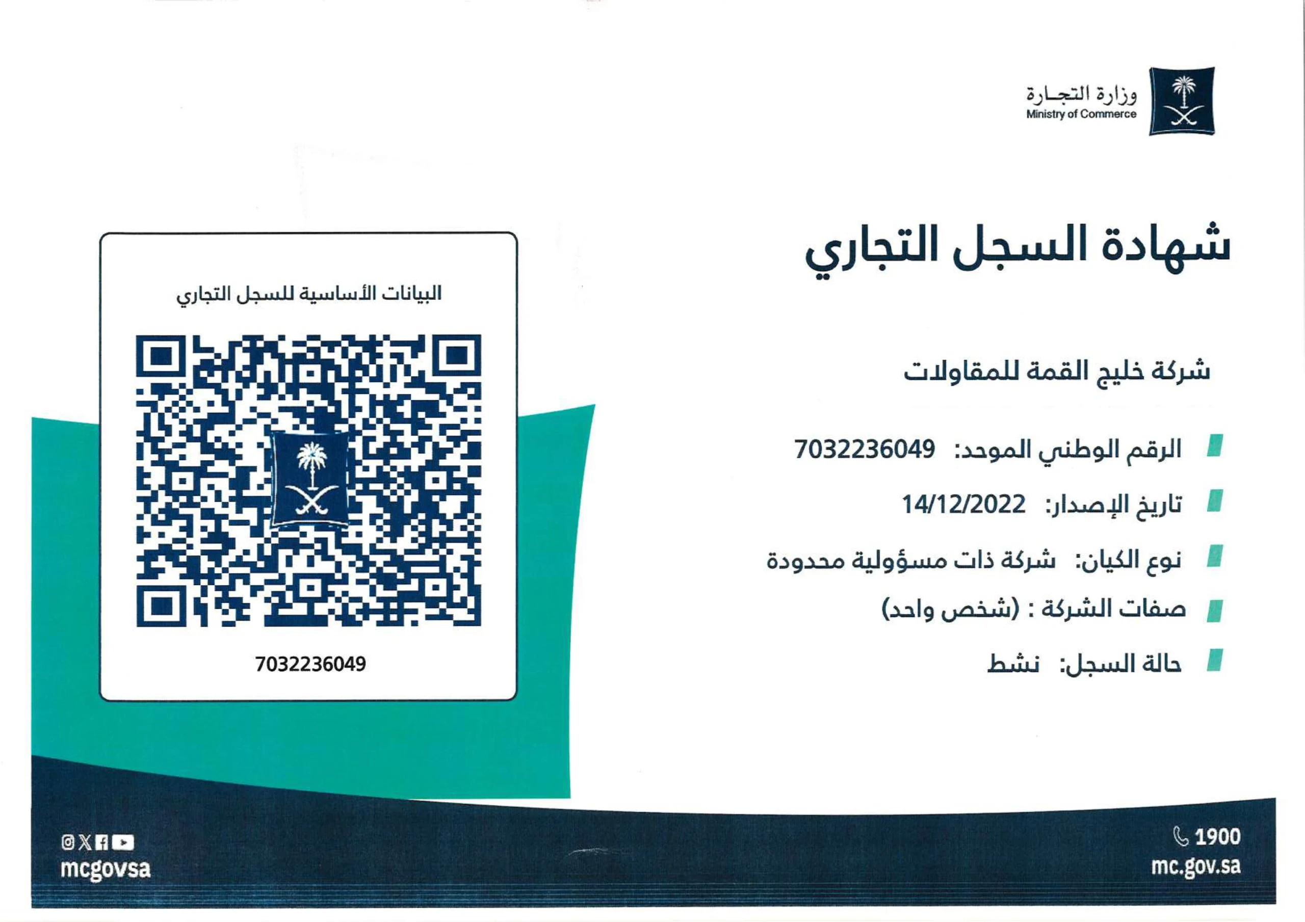 الشهادات و الاعتمادات نعتز بحصولنا على مجموعة من الشهادات والاعتمادات الرسمية التي تعكس التزامنا بأعلى معايير الجودة والاحترافية في تنفيذ مشاريعنا. تواصل معنا شهادة تسجيل القيمة المضافة عرض الوثيقة هيئة الزكاة و الضريبة و الجمارك عرض الوثيقة العنوان الوطني عرض الوثيقة شركة التقنيون (سعودي تك) عرض الوثيقة بيان معدات فرقة (1) و (2) عرض الوثيقة بيان معدات فرقة (3) و (4) عرض الوثيقة شهادة السجل التجاري عرض الوثيقة
